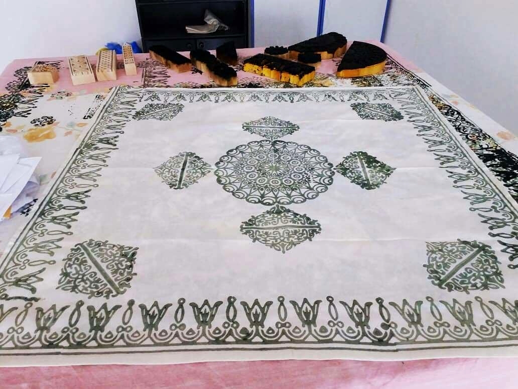 “Hazırlanan desenler CNC tezgahlardan kalıp olarak çıkarılır. Kalıplar hafifliğinden, kolay oyulabilme özelliğinden ve boyayı çekme özelliğinden dolayı ıhlamur ağacından yapılıyor. Geniş bir leğenin tabanına keçe konulur. Üzerine siyah kök boya, Çiriş ve sıcak su karışımı dökülür ve uygulama öncesi bir saat dinlendirilir. Sonra kalıplar leğenin içine konup boyayı eminceye kadar bekletilir. Kalıplar tek renk siyahtır. İstenirse uygulama esnasında fırçayla aralara başka renk de atılabilir. Baskı işlemi başta açık yeşil olup kurudukça siyahlaşır. Siyahlaşan ve kuruduğundan emin olunan örtü iki gün sonra suyuna özel bir kimyasal katılarak yıkanır ve kullanıma hazır hale gelir.