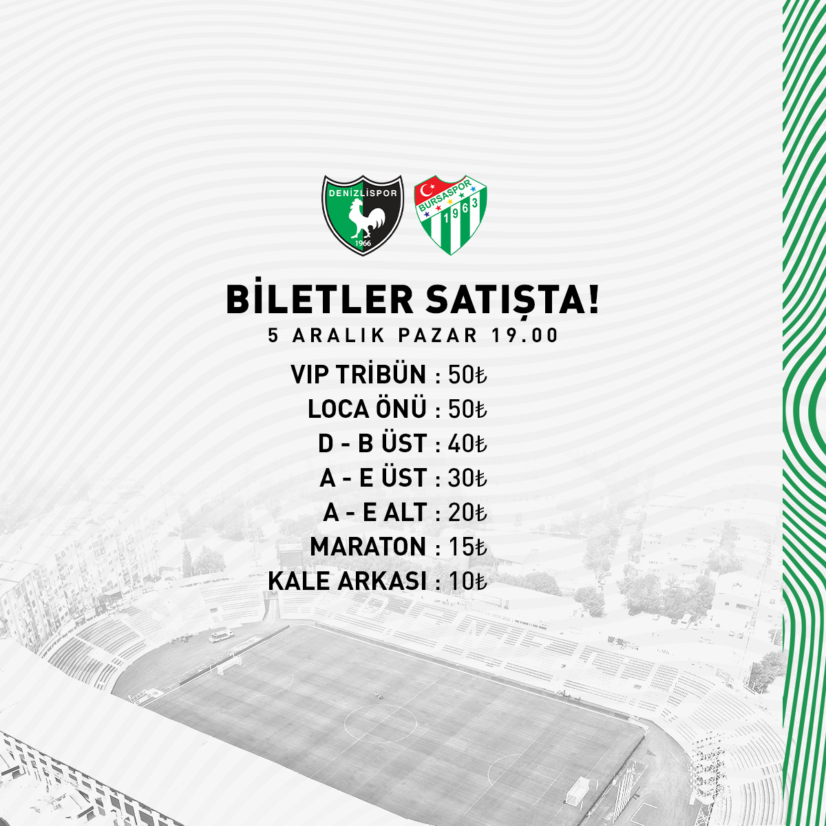 Altaş Denizlispor TFF 1. Lig'in 15. hafta mücadelesinde evinde oynayacağı Bursaspor maçı öncesi hazırlıklarına devam ediyor. Son olarak Kupa'da Ağrı 1970 Spor engelini 3 golle geçen yeşil siyahlılar ligde 5 Aralık Pazar günü saat 19.00'da Denizli Atatürk Stadyumu'nda oynanacak zorlu mücadelenin biletleri de satışa çıktı. Yapılan açıklamada en yüksek bilet fiyatı 50 TL, en düşük bilet fiyatı ise 10 TL olarak belirlendi.