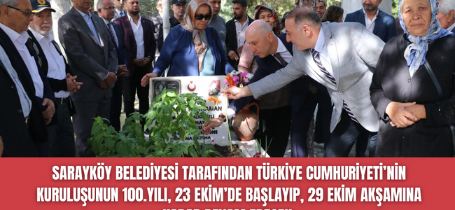 Sarayköy Belediyesi tarafından Türkiye Cumhuriyeti’nin kuruluşunun 100.yılı, 23 Ekim’de başlayıp, 29 Ekim akşamına kadar devam edecek birbirinden farklı etkinliklerle kutlanacak. İlk programda Cumhuriyet’in önemli taşları olan şehitler ve milli mücadele kahramanları anıldı. Şehit yakınları ve gazilerle bir araya gelindi.
