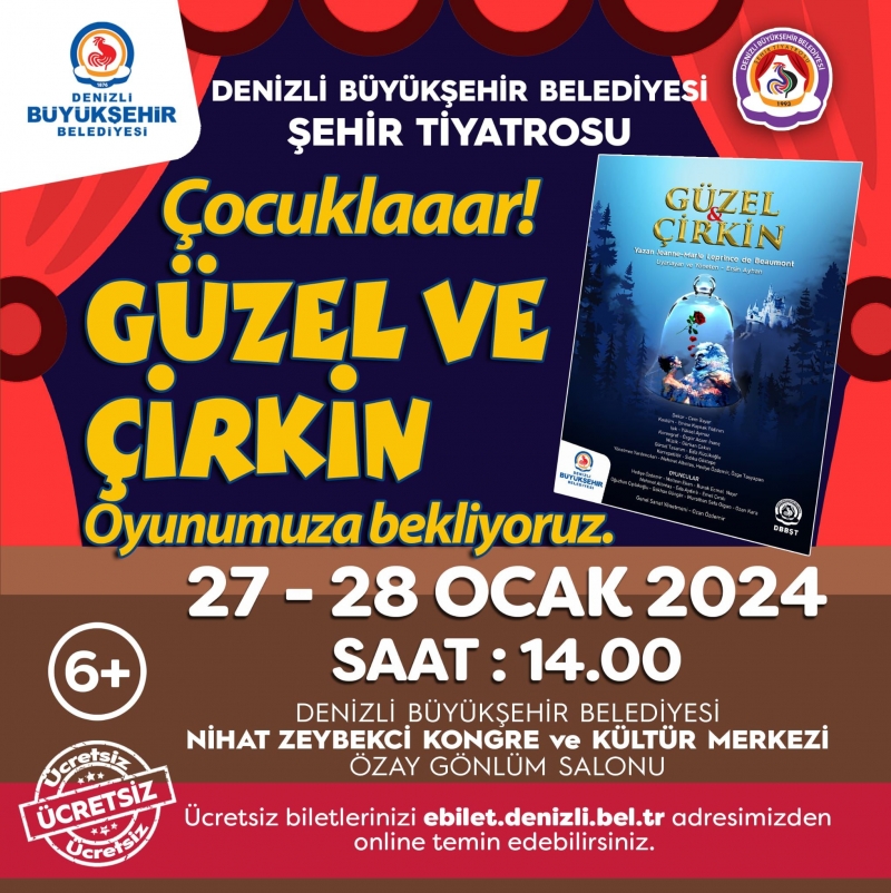 Denizli Büyükşehir Belediyesi, okulların ara tatil dönemine girmesinin ardından çocukların daha verimli ve eğlenceli bir tatil geçirebilmeleri için ücretsiz çocuk tiyatrosu ve planetaryum gösterimleri hazırladı. Bu kapsamda, Denizli Büyükşehir Belediyesi Şehir Tiyatrosu’nun hazırladığı Güzel ve Çirkin Müzikali 6 yaş ve üzeri çocuklar için sahnelenecek. 27-28 Ocak 2024 saat 14.00’te Büyükşehir Belediyesi Nihat Zeybekci Kongre ve Kültür Merkezi Özay Gönlüm Salonu’nda gerçekleştirilecek müzikalin ücretsiz biletleri bugünden itibaren (24 Ocak) ebilet.denizli.bel.tr’den alınabilecek.
