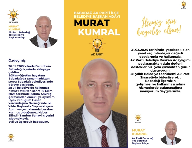 Babadağ'ın bağrından çıkan, topluma hizmet etme aşkıyla dolu Murat Kumral, 31 Mart 2024 yerel seçimlerinde AK Parti Babadağ Belediye Başkan adayı olarak halkının karşısına çıkıyor. Hayatını ilçesinin gelişimine adayan Kumral, uzun yıllar boyunca zabıta amirliği görevini yürüttü ve bu süre zarfında toplumun huzur ve düzeni için çalıştı. Hasen Yardımlaşma Derneği'nde başkanlık yaparak toplumsal dayanışmaya katkı sağlayan Kumral, aynı zamanda Habeş Silindir Tambur Sanayi'nin yönetiminde aktif bir rol alıyor. Üç çocuk babası olan ve Babadağ'da dünyaya gelen Murat Kumral, ilçesine olan sevgisini ve hizmet etme arzusunu "İlçemiz için hayırlısı olsun" sloganıyla ifade ediyor. 28 yıllık değerli belediye tecrübesini AK Parti'nin yenilikçi siyasetiyle birleştiren Kumral, Babadağ'ın gelişimi ve refahı için umut vaad eden projeleriyle halkının desteğini bekliyor. Murat Kumral, "Değerli dostlarım ve kıymetli hemşehrilerim, sizlerle birlikte Babadağ'ımızı hak ettiği parlak geleceğe taşıyacağımıza inancım tam," diyerek, herkesi bu umut dolu yolculuğa ortak olmaya çağırıyor. Babadağ için yeni bir dönem, Murat Kumral'ın liderliğinde başlıyor.