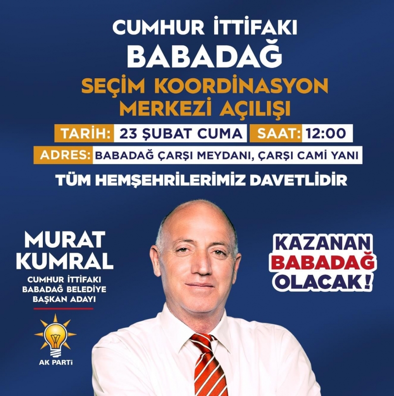 Babadağ, geleceğe yönelik büyük adımlar atmaya devam ediyor. Bu kapsamda, AK Parti Belediye Başkan Adayı Murat Kumral'ın öncülüğünde, Babadağ Seçim Koordinasyon Merkezi'nin açılışı gerçekleştirilecek. Açılış töreni, tüm Babadağ halkının katılımına açık olup, şehrin daha da ileriye taşınması için bir araya gelinmesi amacıyla düzenleniyor. Açılış etkinliği, 23 Şubat 2024 Cuma günü saat 12.00'de, Babadağ Çarşı Meydanı'nda, Çarşı Cami'nin yanında yer alacak. Murat Kumral ve ekibi, Babadağ'ı ileriye taşıma vizyonu doğrultusunda, tüm hemşehrilerini bu önemli günlerinde yanlarında görmek istiyor. Açılışa katılarak, Babadağ'ın geleceğine yön verme sürecinde yer alabilir, şehrin kalkınması için atılacak adımlara destek olabilirsiniz. "Babadağ'ımızı daha da ileriye taşımak için el ele, gönül gönüle vereceğiz" diyen Murat Kumral, açılışa tüm Babadağ halkını davet ediyor. Bu özel gün, Babadağ'ın birlik ve beraberliğini pekiştirecek, gelecek projeleri için güçlü bir başlangıç olacak. Babadağ için umut dolu yarınlar adına, bu önemli etkinliğe katılımınızı bekliyoruz.