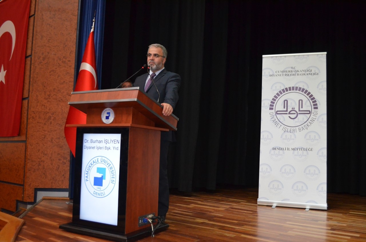 Diyanet İşleri Başkanlığı’nın düzenlediği ‘Dini Yayınlar Tanıtım Toplantısı’, Pamukkale Üniversitesi (PAÜ) Kongre ve Kültür Merkezi’nde gerçekleştirildi. Programa, Diyanet İşleri Başkan Yardımcısı Dr. Burhan İşliyen, İl Müftüsü Mehmet Aşık, Müftü Ahmet Hulusi Efendi Eğitim Merkezi Müdürü Dr. Mustafa Acar, İl Müftü Yardımcısı Hasan Hüseyin Palabıyık, İlçe Müftüleri, Vaizler, daire personeli, din görevlileri ile Kur’an kursu öğreticileri katıldı. Saygı duruşu ve İstiklal Marşı’nın okunmasıyla başlayan program, Siteteler Camii İmam Hatibi Hasan Soyuçok’un Kur'an-ı Kerim tilavetiyle devam etti. Programın açılışında konuşan İl Müftüsü Mehmet Aşık, “Dini yayınları tanıtmak maksadıyla Denizlimizi teşrif eden Kıymetli Başkan Yardımcımıza, siz değerli personelimize hoş geldiniz diyorum. Bugün burada toplantı yapmamızın sebebi ise, Başkanlığımız tarafından hazırlanan Türkçe, yabancı dil ve lehçelerde basılı, süreli, radyo ve televizyon yayınlarının tanıtımı yapılarak, siz değerli görevlilerimiz sayesinde vatandaşa ulaştırılmasını sağlamaktır. Cenab-ı Allah’tan bu toplantımızı hayırlara vesile kılmasını dilerim.” dedi. Konuşmacı Diyanet İşleri Başkan Yardımcısı Dr. Burhan İşliyen ise, “Toplumu din konusunda aydınlatmak görevi Başkanlığımıza verilmiştir. Dinimizi vatandaşa doğru öğretme ve toplumu sahih dini bilgi ile buluşturma noktasında; televizyon, internet, radyo, mobil uygulama, kitap, dergi ve benzeri bütün yayınlarla tüm Diyanet camiası el birliği ile çalışmak zorundayız. Toplumu dini bilgileri öğretmede kitle iletişim araçlarının önemi aşikârdır. Siz kıymetli din görevlilerimize, dini yayınlarımızın vatandaşlara ulaştırılmasında önemli vazifeler düşmektedir.” dedi. Konuşmaların ardından, Başkan Yardımcısı Dr. Burhan İşliyen’e İl Müftüsü Mehmet Aşık tarafından, günün anısına; 15 Mayıs 1919’da Müftü Ahmet Hulusi Efendi'nin Denizli meydanında halka millî mücadele için verdiği fetvanın hediye edilmesiyle program son buldu.