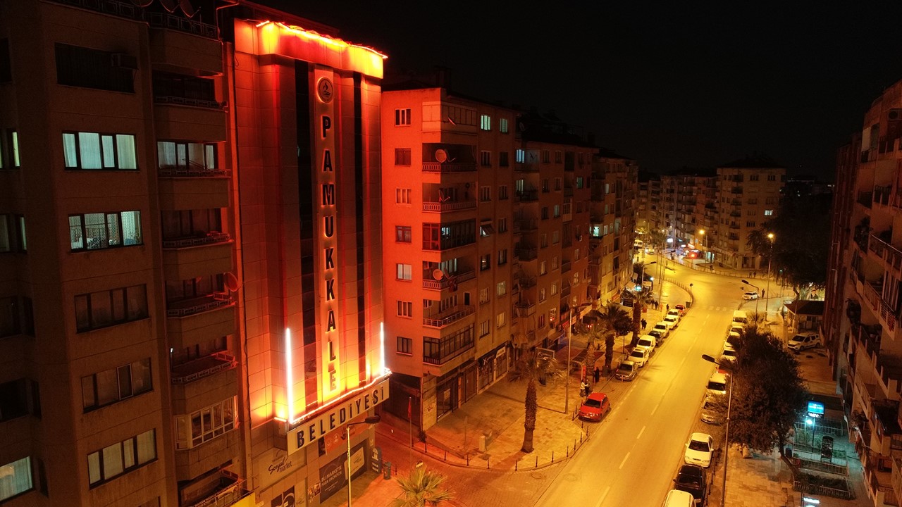 Pamukkale travertenleri ile Pamukkale Belediyesi Ek Hizmet binası turuncu ışıklan aydınlatıldı.