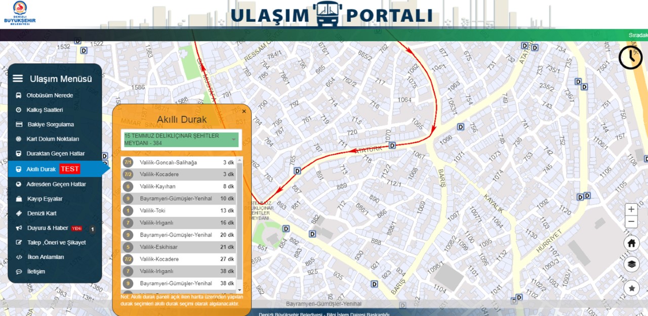 Denizli Büyükşehir Belediyesi, toplu taşıma sisteminde Türkiye'ye örnek olacak yeni bir uygulamayı daha başlattı. Daha önce masa üstü veya mobil iletişim araçlarından belediye otobüslerinin anlık konum bilgileri, otobüs hareket saatleri gibi bir çok bilgiye anında ulaşan Denizlililer 2019'un ilk gününden itibaren Akıllı Durak Bilgi Sistemi uygulamasını kullanmaya başladı. Denizli Büyükşehir Belediyesi Bilgi İşlem Dairesi Başkanlığı tarafından geliştirilen Akıllı Durak Bilgi Sistemi, Ulaşım Portalı uygulaması üzerinden çalışıyor. Ulaşım Portalı uygulamasına eklenen Akıllı Durak özelliği sayesinde vatandaşlar mobil cihazları ile otobüs duraklarına geldiklerinde bulundukları duraktan geçecek tüm hat otobüslerinin kaç dakika sonra orada olacağı bilgisine an be an ulaşabiliyor.