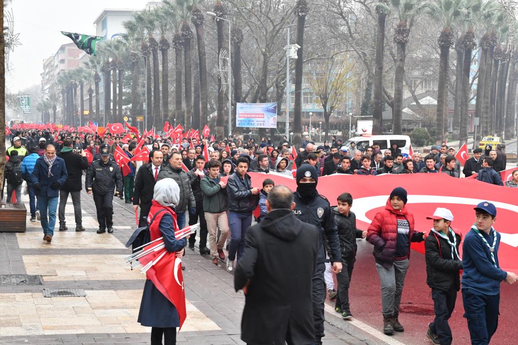 15 Temmuz Şehitler Meydanında toplanan katılımcılara Valimiz Hasan Karahan’ın da katılımıyla başlayan yürüyüş, Denizli Büyükşehir Belediyesi Bando takımının seslendirdiği marşların hep bir ağızdan söylenmesi ve ellerdeki Türk Bayraklarının sallanmasıyla Valilik önüne doğru yol aldı. Cadde üzerinde evleri bulunan vatandaşların da balkonlarından bayrak sallayarak destek verdiği yürüyüş, yol boyunca yürüyüşe katılan vatandaşlarla birlikte coşkulu bir kalabalığa dönüştü. Yürüyüş esnasında öğrenciler zaman zaman “Vatan sana canım feda” ve “Şehitler ölmez, Vatan bölünmez” şeklinde slogan attı.