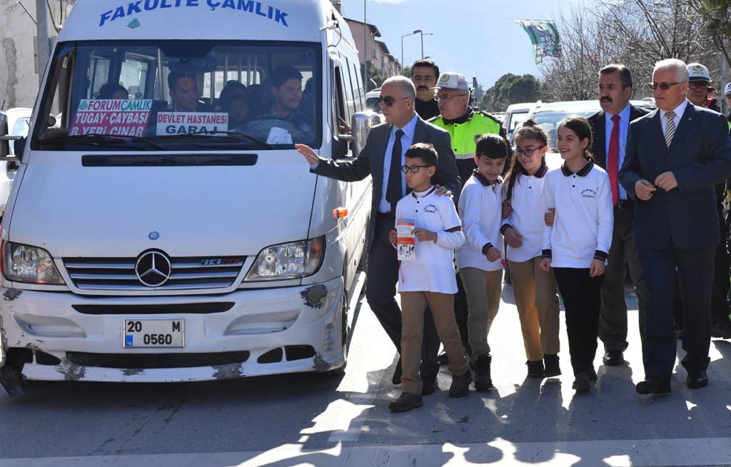 Valimiz Hasan Karahan, Pamukkale Kaymakamı Hayrettin Balcıoğlu, Merkezefendi Kaymakamı Dr. Adem Uslu, Denizli İl Emniyet Müdürü Mevlüt Demir, İl Jandarma Komutanı J. Alb. Metin Düz ve İl Milli Eğitim Müdürü Mahmut Oğuz’un katılımı ile Lise Caddesi üzerinde bulunan 100. Yıl Mehmetçik Ortaokulunda bugün saat 12.00 - 12.30 arasında "yaya öncelikli trafik" algısı oluşturmaya yönelik düzenlenen farkındalık faaliyeti kapsamında; okuldan çıkan öğrenciler yaya geçidine giderek karşıdan karşıya geçti. Öğrencilerle birlikte karşıdan karşıya geçen Valimiz Hasan Karahan ve İl Emniyet Müdürü Mevlüt Demir sürücülere emniyet kemerini taktığı ve yayalara yol verdikleri için teşekkür etti. Öğrenciler daha sonra Valimiz Karahan ile birlikte sürücülerin bilinçlenmesi için şoförlere broşür dağıttı.