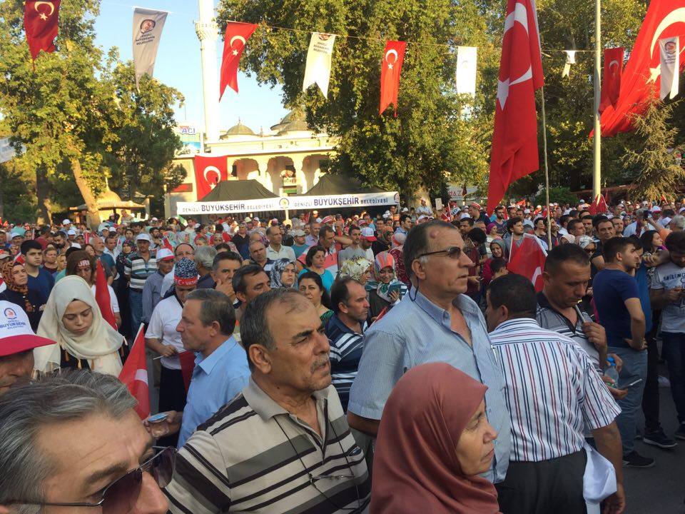 Hain FETÖ terör örgütünün başarısızlıkla sonuçlanan 15 Temmuz darbe girişiminin ardından halk cumhurbaşkanı Recep Tayyip Erdogan'ın demokrasiye sahip çıkmak için meydanlara inin ve demokrasiye sahip çıkın talimatıyla 24 gündür meydanlardan ayrılmadı. Türkiye, demokrasi nobetini pazar günü başta Istanbul olmak üzere tüm illerde Büyük demokrasi nobetiyle taclandirdi. Denizli'deki adres ise Çınar meydanı oldu. Saraykoy Belediyesinin ücretsiz araç tahsis ettiği büyük mitinge Saraykoyluler adeta çıkarma yaptı. Yoğun bir katılımın olduğu büyük demokrasi mitinginde Ekonomi Bakanı Nihat Zeybekci, Denizli Valisi, Denizli Büyükşehir Belediye Başkanı Osman Zolan, Milletvekilleri, Belediye Başkanları ve halk katildi. On binlerin doldurduğu meydandaki coşku görülmeye değerdi. Cumhurbaşkanı Erdogan in Yenikapi'daki konuşmasının canlı yayınla ekranlardan görüntülendigi anlarda ise coşku doruğa çıktı. Demokrasi nobetleri Carsamba gunu tamamlanacak.