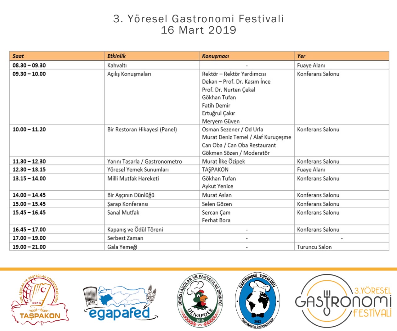 Panel, konferans, yöresel yemek sunumları, sergi ve atölye çalışması gibi birçok etkinliğin yer alacağı festivalde Tüm Aşçılar ve Pastacılar Konfederasyonu (TAŞPAKON) 7 bölge federasyonu ile yer alırken, Türkiye ve K.K.T.C’den birçok üniversite katılacak. ‘YARINI TASARLA-DESIGN TOMORROW’ temasıylabu yıl üçüncüsü düzenlenen Yöresel Gastronomi Festivali’nde TAŞPAKON Genel Başkanı Gökhan Tufan, Türkiye Lokantacılar ve Pastacılar Federasyonu Genel Başkanı E. Aykut Yenice, Can Oba, Osman Sezener, Murat Deniz Temel gibi ünlü şeflerin yanı sıra Somelyer Selen Gözen, Gastronometro Eğitmen Şefi Murat İlke Özipek, Onedio Yemek Şefi Sercan Çam, Yemek.com Şefi Ferhat Bora, FoodinLife Gastronomi Yayınları Genel Yayın Yönetmeni Gökmen Sözen ve Big Chefs Türkiye Mutfak Koordinatörü Murat Aslan panelist ve konuşmacı olarak deneyimlerini paylaşacak.