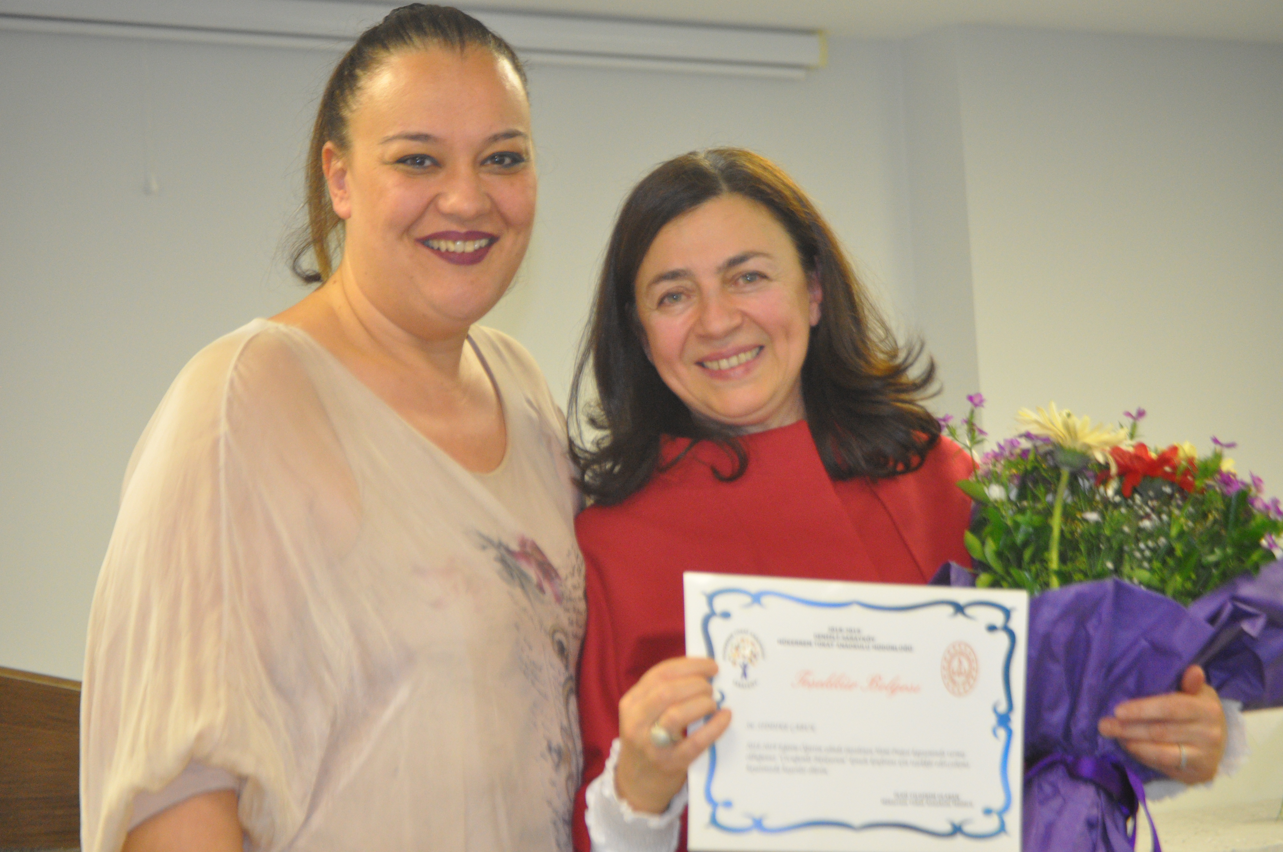 Konferans sonrasında Mükerrem Tokat Anaokulu Müdürü Ülkü Yıldırım Ulaşan, ve Özel Yamaç Anaokulu Müdürü ve Uzman Psikolog Sıdıka Çabuk’a başarı belgesi ve bir demet çiçek takdim etti.