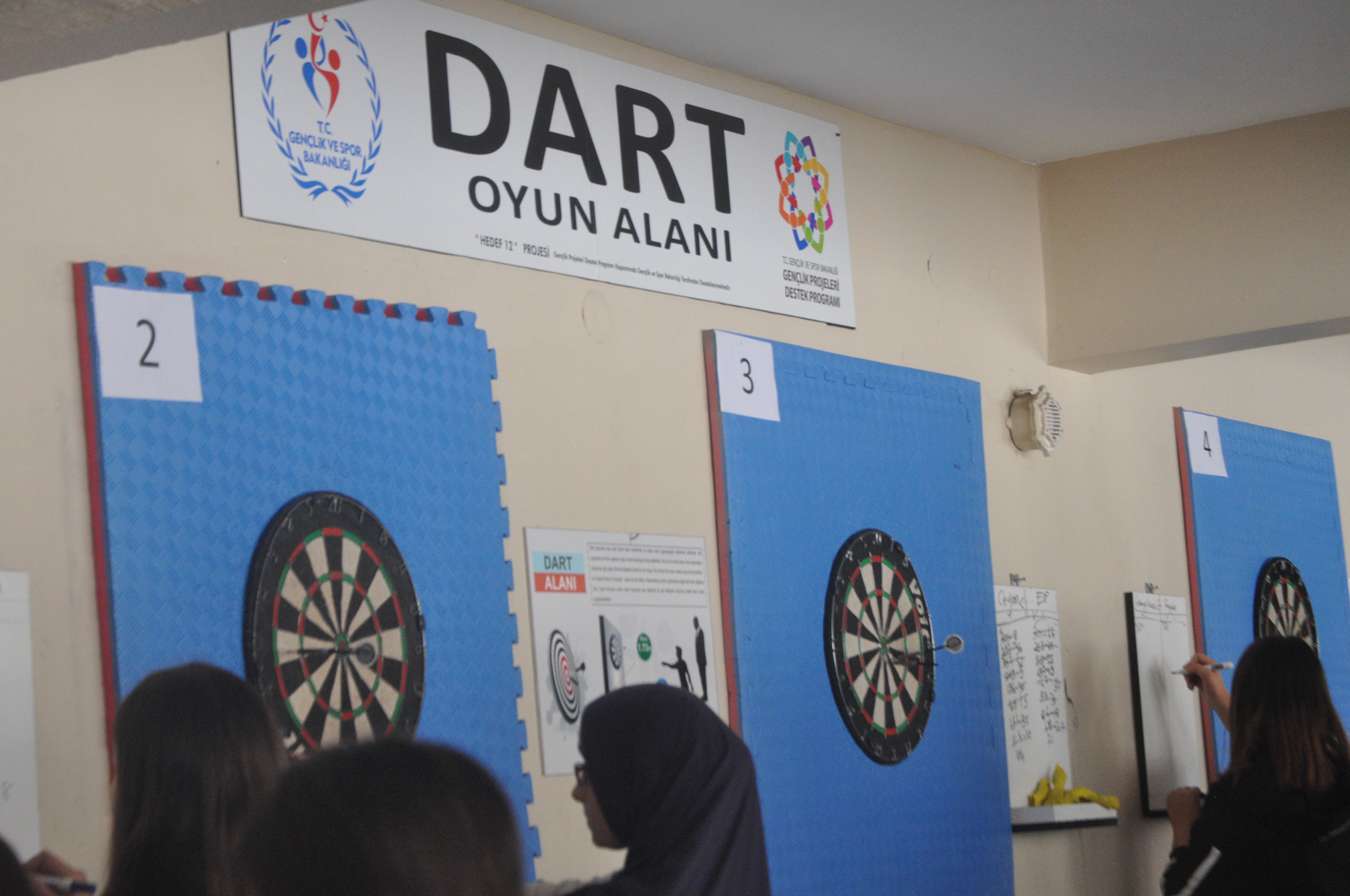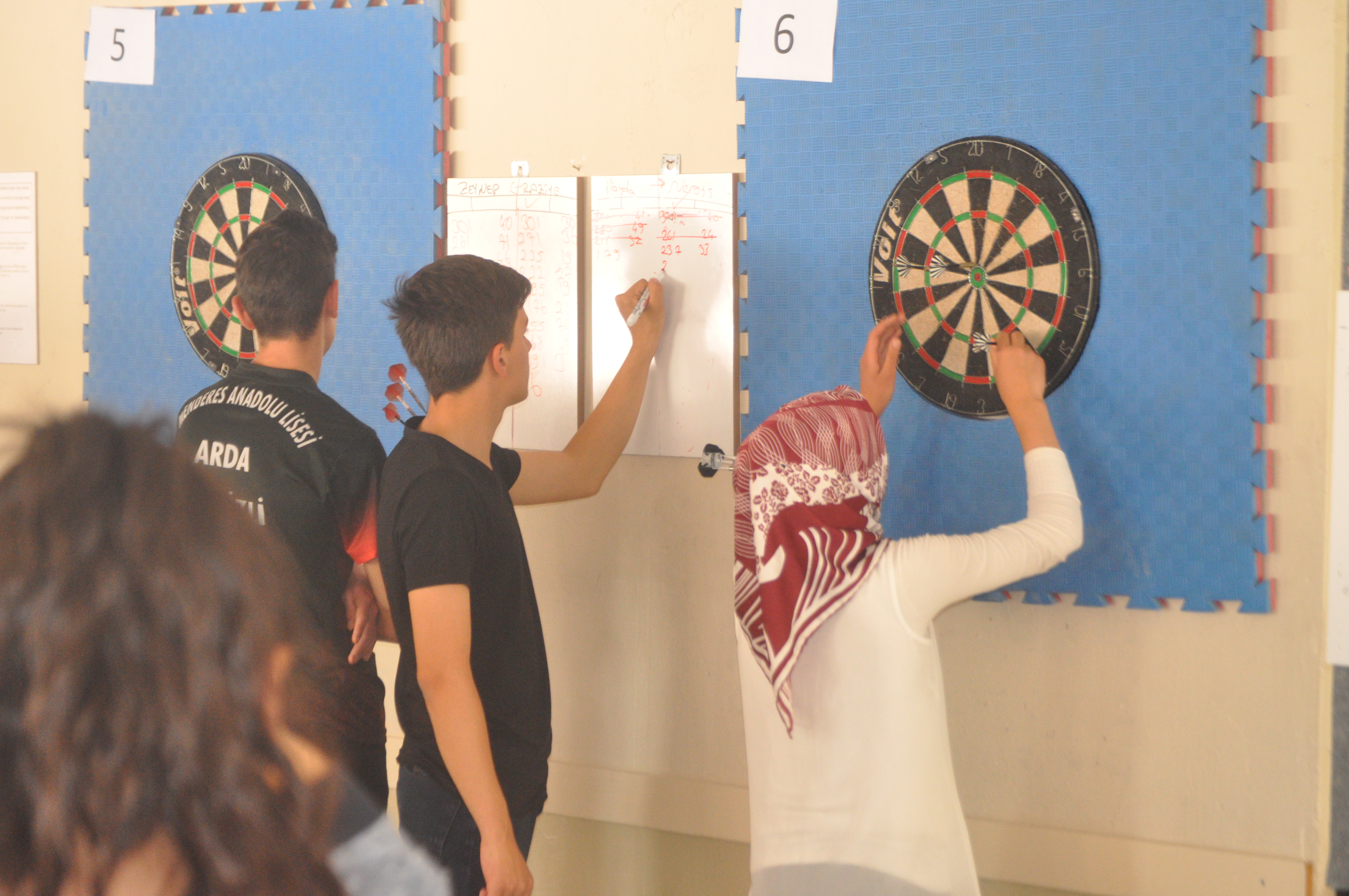 Dart hakemi öğrenciler puan tablosuna skorları yazdılar.