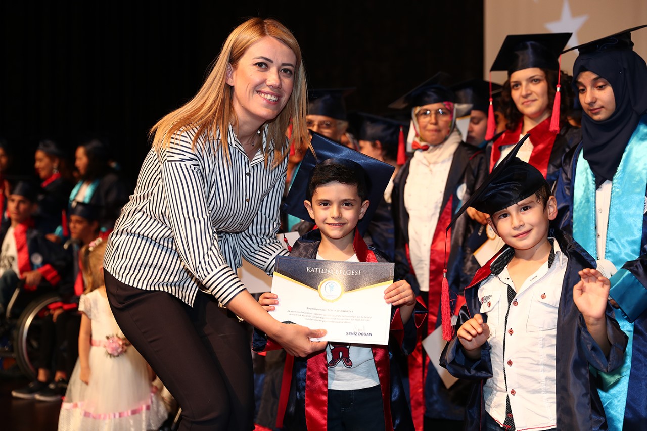 Merkezefendi Belediyesi Engelsiz Yaşam Akademisi’nde meslek atölyelerinde ve el işi kurslarında eğitim gören öğrenciler, Merkezefendi Belediyesi Kültür Merkezi’nde düzenlenen törenle mezuniyet sevinci yaşadılar. Merkezefendi Belediye Başkanı Şeniz Doğan, “113 öğrencimizle birlikte bir yıl boyunca çalıştık. Onlardaki değeri keşfedip, daha yükseklere çıkarmayı başardık. Anne ve babalar, sizler daha çok yoruldunuz, emek verdiniz. Sizlere minnettarız. Her konuda elimizi taşın altına koymaya hazırız” dedi.