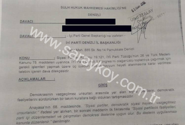 İYİ Parti Denizli İl Başkanlığı kongreye gitmek için üyeleriyle görüşüp yeni yönetim oluşturmaya çalışırken parti içinden bir kişi yönetime kayyum atanması için mahkemeye başvurdu. Eğer mahkeme kararı onaylarsa Denizli İyi Parti İl Başkanlığına kayyum atanacak.