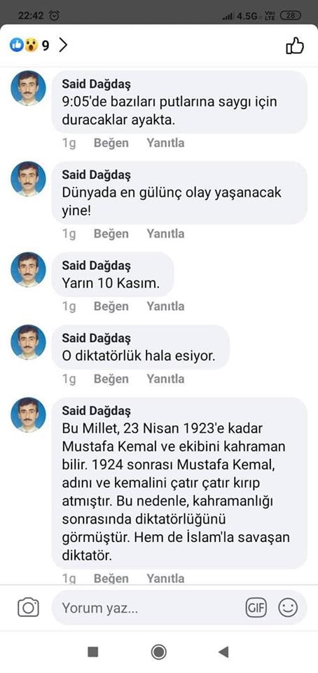 Vekil Öztürk, kendisine ait sosyal medya adresinden Atatürk’e hakaret eden şahsın sadece birkaç paylaşımını yayınlayarak, “Orman Genel müdürlüğünde şube müdürüymüş. Hem Türkiye Cumhuriyet’inin kurucusu Atatürk ‘e hertürlü hakareti yap. Hemde bu devletin ekmeğini ye. Devlet’in lokması boğazına dizilsin inşallah. Atatürk olmasaydı kim bilir hangi Yunan’ın marabalığını yapıyordun be müptezel. Denizli’den senin gibi bir Atatürk düşmanı çıktıya ona mı yanayım, Mülakatlarda en ufak Atatürk ‘e sevgisini hissettiren gençlerimizin elenmesine mi yanayım, Senin gibilerin Devlet’imizin ekmeğini yiyip fırsat buldukça Gazi Paşa’ya küfür etmesine mi?” ifadelerinde bulundu. Sözde Devlet Memuru olan şahsın sosyal medya adresinde Atatürk ile ilgili hakarey içeren bir çok paylaşımların olması da dikkatlerden kaçmadı. Denizli İYİ Parti Milletvekili Yasin Öztürk, Orman Genel Müdürlüğünde görevli olan bu şahısla ve onun paylaşımına destek yazıları yazan bazı şahıslarla ilgili olarak TBMM’de soru önergesi verileceğini açıkladı. Vekil Öztürk ayrıca adı geçen şahısla ilgili olarak da suç duryurunda bulunacaklarını belirtti