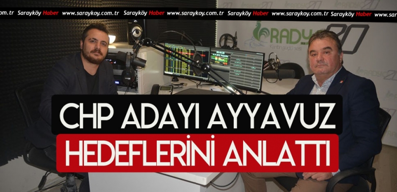 Sarayköy CHP İlçe Başkan Adayı Nazım Ayyavuz, bölgenin en çok dinlenen radyosu Radyo 20’de yayınlanan, Ümit ile Radyotik Gündem programının konuğu  oldu.  Her sabah saat 09.00-13.00 saatleri arasında yayınlanan programa saat 10.00’da konuk olan Nazım Ayyavuz,  canlı yayında Sarayköy ilçesinde yapılacak olan adaylık ve delege  seçimleri ve seçimi kazandığı takdirde neler yapacağı konusunda bilgiler verdi.  Nazım Ayyavuz, program yapımcısının sorusu üzerine kendisine ‘abi’ diye hitap edilmesini istedi. Ayyavuz, “ Sen bana Nazım bey dediğin takdirde aramıza duvarlar örülmüş gibi hissediyorum. Bugüne kadar herkes bana ulaşabildi, bundan sonra da böyle devam edece”  İfadelerini kullandı.
