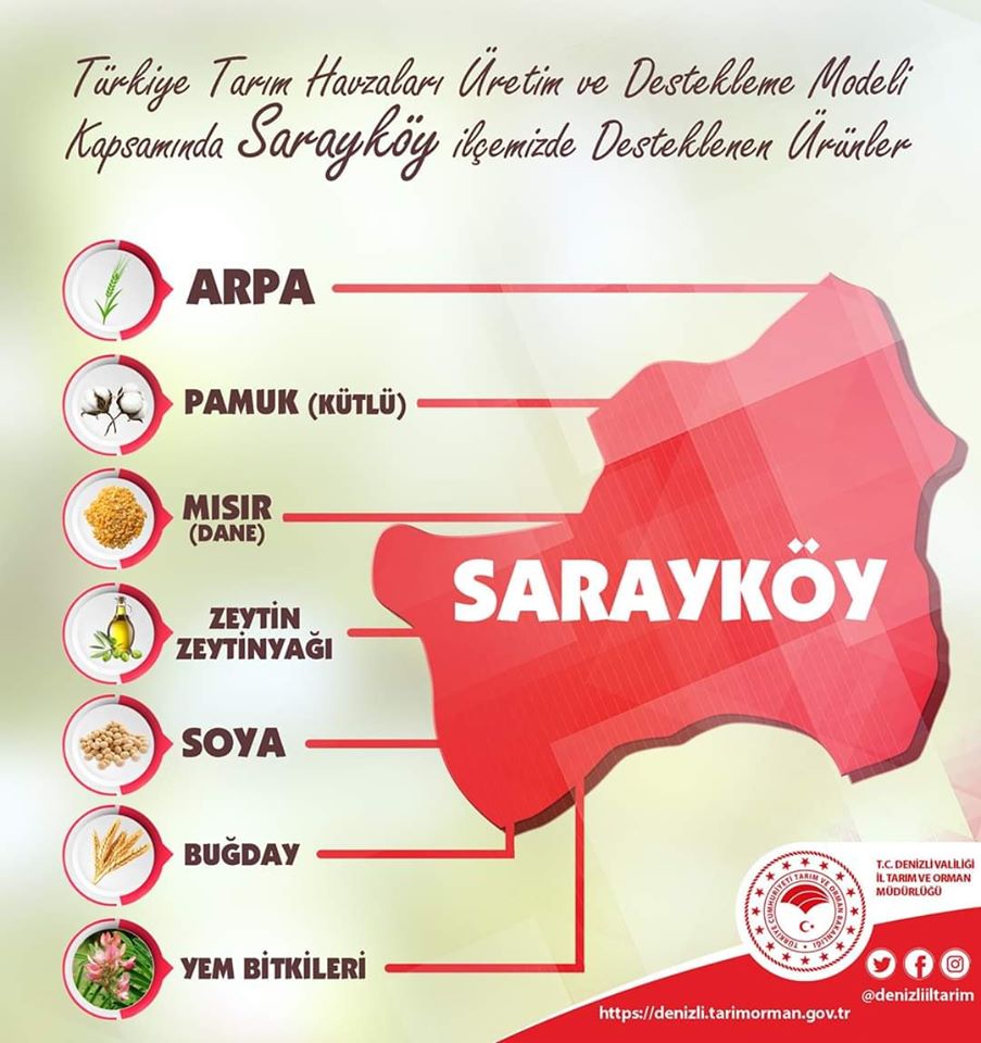 Türkiye Milli Tarım Destekleme Modeli" kapsamında iklim, toprak, topografya, verim, su kısıtı gibi faktörler açısından ülke genelindeki tüm ilçeler tek tek incelenerek, Türkiye genelinde 941 tarım havzası belirlenmiştir. Tarım faaliyetlerinin planlama çerçevesinde yapılması, toprakların boşa ekilmemesi, üretilen ürünlerin elde kalmaması ve arz talep dengesizliğinin yaşanmaması için hayata geçirilen bu model ile belirlenen 941 tarım havzasında 2020 üretim yılında desteklenecek ürünler belirlendi. Türkiye Tarım Havzaları Destekleme Modeli kapsamında Sarayköy’de desteklenen ürünler belli oldu.