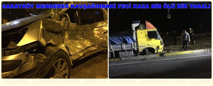 Alınan bilgiye göre Sarayköyde menderes kavşagındaki kazada 32 E 0582  plakalı kamyon ile 20 L 2360 plakalı otomobil çarpıştı. Otomobildeki 1 kişi öldü, 1 kişi yaralandı.Kazayı gören vatandaşlar polisi ve 112'yi arayarak yardım istedi. Otomobilde bulunanlardan Yalçın Kaya(50) ağır yaralanırken, Mehmet Akdağ(55) ise hayatını kaybetti. Kamyon sürücüsü Soner Sağlam  ise kazayı hafif sıyrıklarla atlattı. Kazazedeler olay yerinde yapılan ilk müdahalelerinin ardından ambulanslarla önce Sarayköy Devlet Hastanesine kaldırılırken daha sonra  Denizli Devlet hastanesine sevk edildi.. Polis kazayla ilgili soruşturma başlattı.