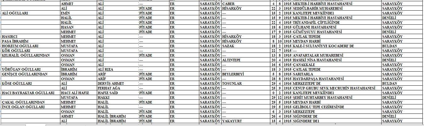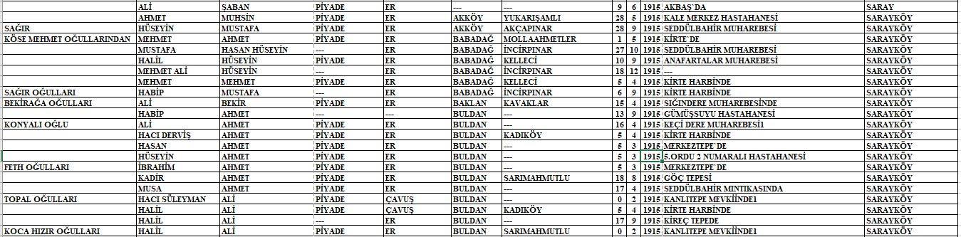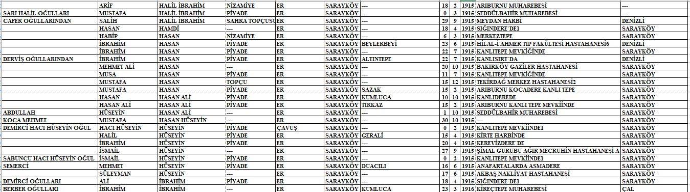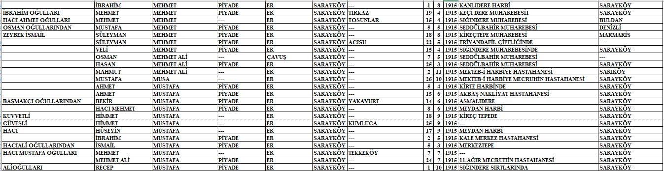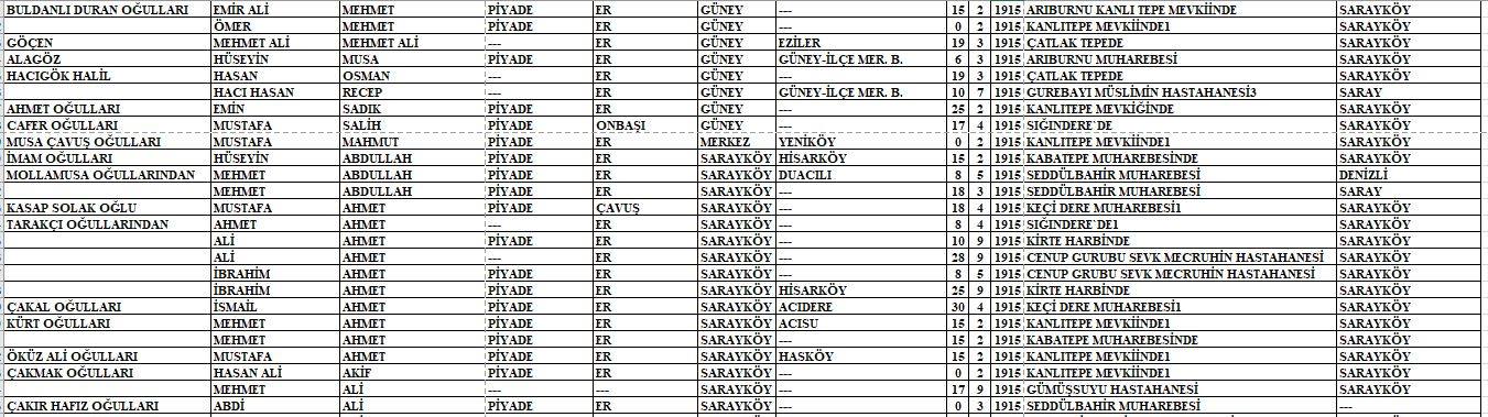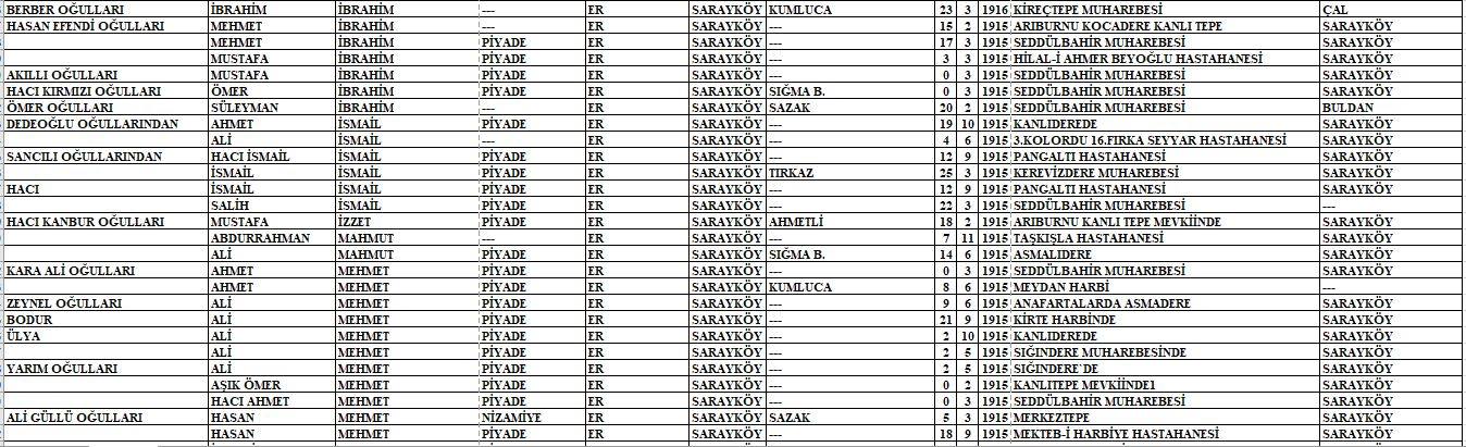 Arşivlerden ulaşılan listede o yıllarda kullanılan lakaplar, baba adı, Mehmetçiğimizin adı, askeri sınıfı, rütbesi, ölüm tarihi ve hayatını kaybettiği nokta yer almaktadır.