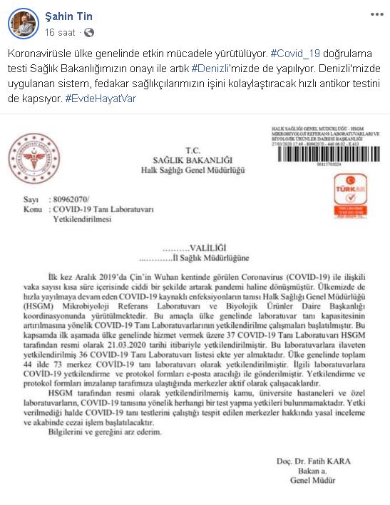 11 Mart 2020 tarihinde korono ile ilgili ilk vakanın vatandaşlarla paylaşılmasının ardından günden güne artan vaka sayısı ile alınan önlemlerde gün be gün artmaktadır. Sağlık Bakanı Fahrettin Koca yapmış olduğu açıklama ile covid-19 testinin ülke içerisindeki illere dağıtımının yapılacağını duyurmuştu. Ama ne zaman geleceği konusunda tam tarih olmaması akıllarda soru işareti oluştururken , AK Parti Denizli Millet Vekili olan Şahin Tin sosyal medya üzerinden yapmış olduğu paylaşım ile  Covid-19 virüsünü doğrulama testinin Denizli’ye getirildiğini duyurdu. Denizli Ak Parti Millet Vekili Şahin Tin, “Korona virüsü ile ülke genelinde etkin mücadele yürütülüyor.  Covid-19  doğrulama testi Sağlık Bakanlığımızın onayı ile artık #Denizli’mizde de yapılıyor. Denizli'mizde uygulanan sistem, fedakar sağlıkçılarımızın işini kolaylaştıracak hızlı antikor testini de kapsıyor. “ paylaşımında bulundu. Sarayköy haber