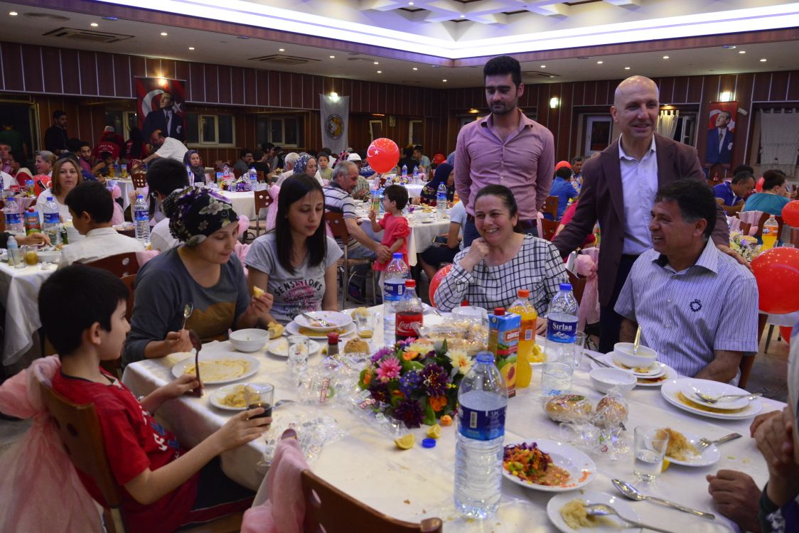 Balon, pamuk şeker ve Osmanlı macununun dağıtıldığı iftar yemeğinde çocuklara kol saati ve çanta da hediye edildi. İlahilerin söylendiği iftar yemeğinin sonunda konuşma yapan Sarayköy Belediye Başkanı Ahmet Necati Özbaş, "Ramazan ayına girdiğimiz günden bu yana iftarımızı hiç evimizde yapmadık. İftarımızı derdi olan, olmayan, yaşlımızın, engellimizin, çat kapı girdiğimiz bir komşumuzun, teyzemizin, amcamızın evlerinde açtık. Bugün Ramazanımızın 15. günü ve Dünya Yetimler Günü. Bende bir yetimim. 2 buçuk yıl önce babamı kaybettim. Baba acısını bazen yaşınız 40 olduğunda yaşıyorsunuz. Bazen dünyaya geldiğinizde anne babanızı hiç tanımıyorsunuz. Bizde bugün Sarayköyümüzdeki özel kardeşlerimiz ile birlikte olmaya çalıştık. Gerek annesi gerek babasını yitirmiş çocuklarımızla bu özel günü dolu dolu yaşamak istedik. Onlarla birlikte iftarımızı açtık. Biz sadece bugün değil her zaman onların yanında olacağız" dedi.